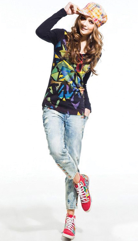 Quần bò ngắn kết hợp cùng những dáng áo phông dài tay (chùm mông hoặc không) tạo thành ra một phong cách khá năng động, cá tính.